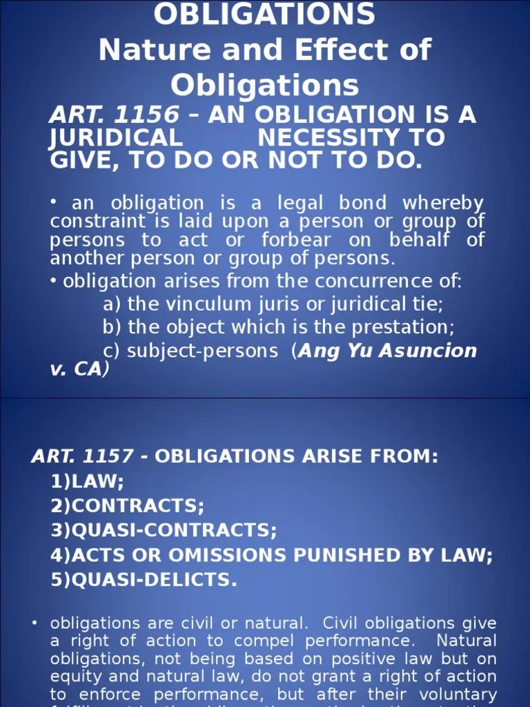 Jul 17, 2012 · civil obligation ‐ obligations which give to the creditor or obligee a right under the law to enforce their performance in courts of justice natural obligations ‐ not being based on positive law but on equity and natural law, do not grant a right of action to enforce their performance although in case of voluntary fulfillment by the debtor example of obligation. An obligation is a juridicalnecessity to give, to do or not to do.